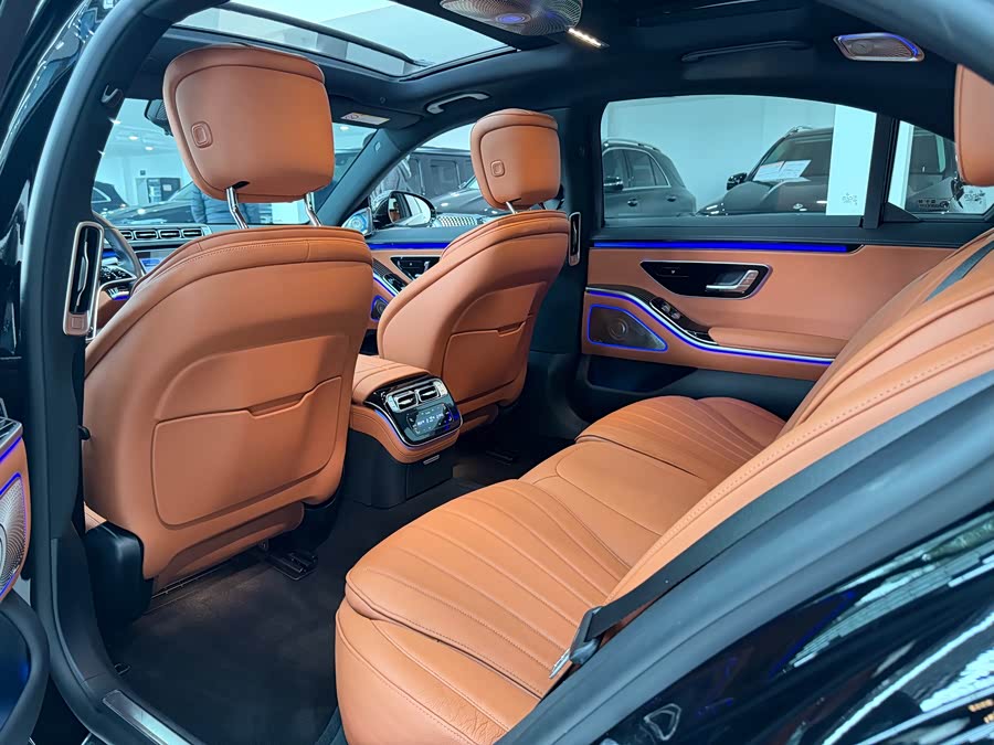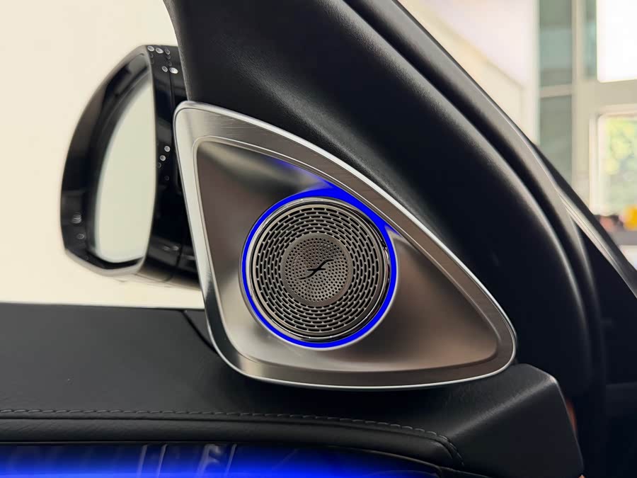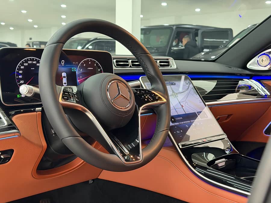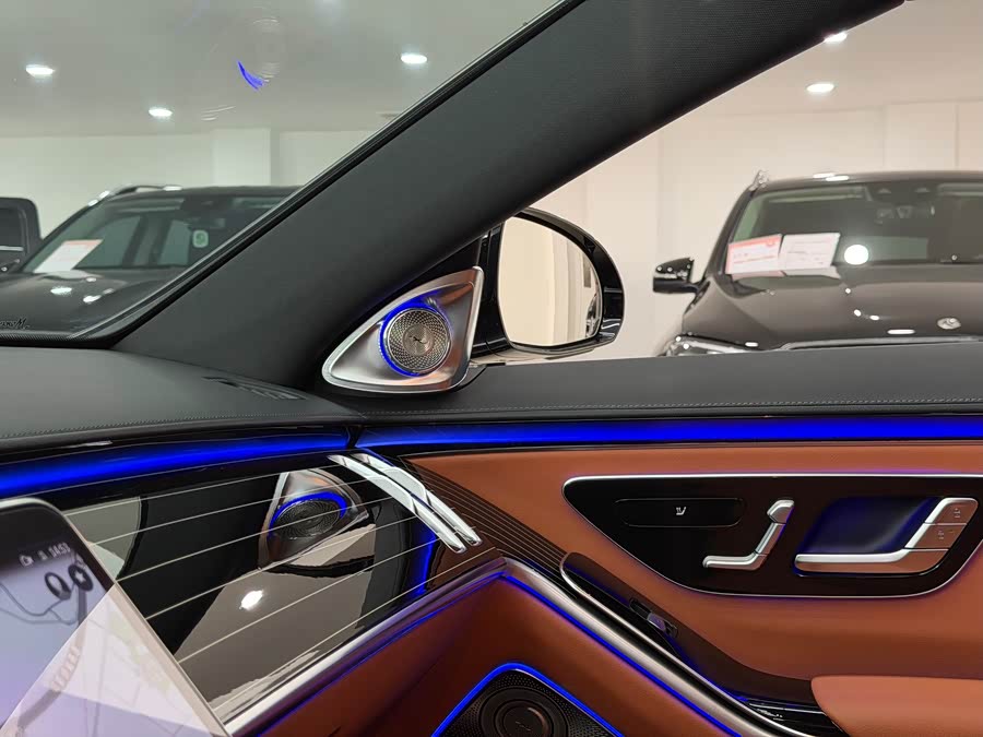 В стандартную комплектацию этого автомобиля входят роскошные диски S400, активная подсветка салона, четырехмерные вращающиеся твитеры, аудиосистема Burmester, управление жестами для задних пассажиров и декоративные панели из черного глянцевого пластика.