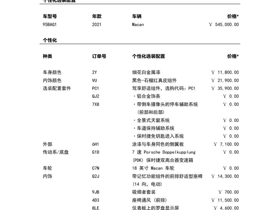 Цвет кузова: 2Y Fine White Metallic Paint ¥11 800,00 Цвет салона: VU Black - Garnet Red Leather Package ¥21 900,00 Дополнительный пакет комплектации PC1 Driving Comfort Package, код покупки: PC1 ¥35 900,00 Отделка из алюминиевого сплава QJ2 ¥0,00 Система помощи при парковке 7X8 с камерой заднего вида ¥0,00 Передний и задний панорамный люк ¥0,00 Система помощи при удержании полосы движения ¥0,00 Система бесключевого доступа Porsche ¥0,00 Внешние боковые крылья 6H1, окрашенные в цвет кузова ¥7 100,00 Трансмиссия/Шасси G1D 7-ступенчатая коробка передач Porsche Doppelkupplung ¥0,00 Коробка передач PDK Porsche с двойным сцеплением Колеса C7N 18-дюймовые диски Macan 0,00 ¥ Комплектация салона: комфортные передние сиденья Q2J с функцией памяти 14 300,00 ¥ Комплектация для курящих 9JB с 14-позиционной электрорегулировкой 700,00 ¥ Вентилируемые передние сиденья 4D3 11 500,00 ¥ Дисплей компаса 8LE на приборной панели 4 600,00 ¥ Кожаный салон 5ZF Эмблема Porsche на подголовниках сидений 5 600,00 ¥ Аксессуары для колес: всесезонные шины H3Q для 18-дюймовых легкосплавных дисков 0,00 ¥ Общая цена: 658 400,00 ¥